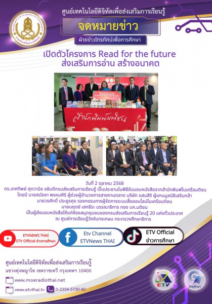 "Read For the future" โครงการส่งเสริมการอ่าน สร้างอนาคต ดร.เกศทิพย์ ศุภวานิช อธิบดีกรมส่งเสริมการเรียนรู้ รับมอบหนังสือเพื่อส่งให้แก่ห้องสมุดชุมชนของกรมส่งเสริมการเรียนรู้ 20 แห่ง ทั่วประเทศ