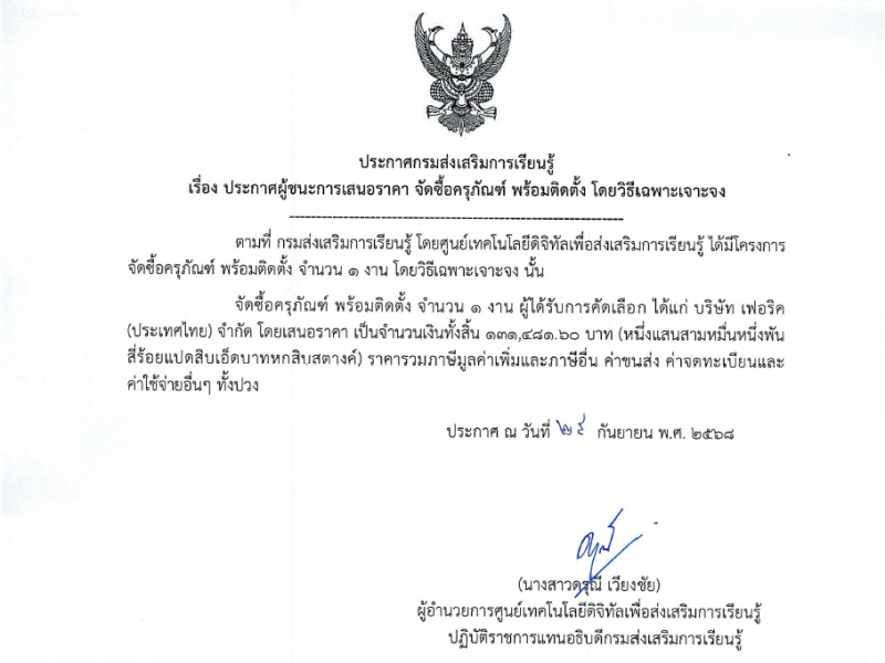 ประกาศผู้ชนะการเสนอราคา จัดซื้อครุภัณฑ์ พร้อมติดตั้ง โดยวิธีเฉพาะเจาะจง