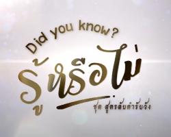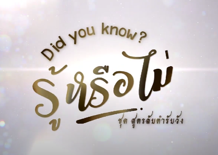◣ETV◢ Did you know? รู้หรือไม่ ชุดสูตรลับตำรับวัง รายการที่จะพาทุกท่านไปทำความรู้จักกับตำหรับอาหารชาววัง เมื่อมีคำว่า “ชาววัง” แล้วตำรับอาหารที่จะมาดูกันจะต้องพิเศษกว่าปกติทั่วไปแน่นอน ความพิเศษของเครื่องเสวยที่ทำขึ้นถวายแด่เจ้านายในราชสำนักนี้ นอกจากจะซ่อนอยู่ทั้งในด้านกรรมวิธีการปรุงที่สุดจะพิถีพิถัน ละเมียดละไมสมกับความเป็น “ชาววัง” โดยแท้แล้ว การคัดสรรวัตถุดิบตลอดจนการจัดสำรับก็เป็นสิ่งที่บ่งบอกเอกลักษณ์ของอาหารจานนั้นๆ ศิลปะการปรุงอาหารชาววังนั้นยังแสดงให้เห็นถึงวัฒนธรรมชั้นสูงในราชสำนักอันเป็นส่วนสำคัญของวัฒนธรรมไทยในปัจจุบันอีกด้วย จำนวน 26 ตอน (สามารถรับชมรายการแต่ละตอนได้โดยคลิกที่ ขีดสามขีด มุมบนขวาของวิดีโอ)