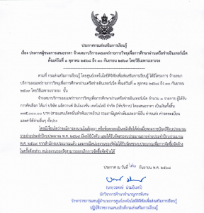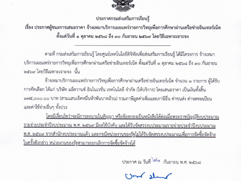 ประกาศผู้ชนะการเสนอราคา จ้างเหมาบริการเผยแพร่รายการวิทยุเพื่อการศึกษาผ่านเครือข่ายอินเทอร์เน็ต ตั้งแต่วันที่ 1 ตุลาคม 2568 ถึง 30 กันยายน 2569 โดยวิธีเฉพาะเจาะจง